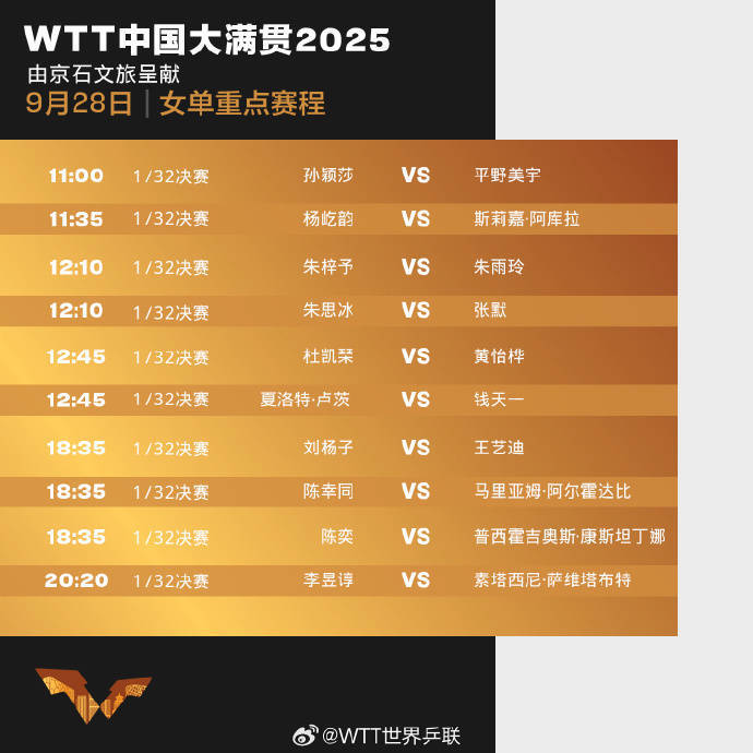 2025年WTT中国大满贯正赛 r今天将在北京石景山首钢园区 r拉开序幕 r女单头号种子孙颖莎 r首轮将对阵日本选手平野好意思宇 r重返男单全国名按次一的王楚钦 r首轮将迎战韩国选手张禹珍 r首日赛程如下↓ r