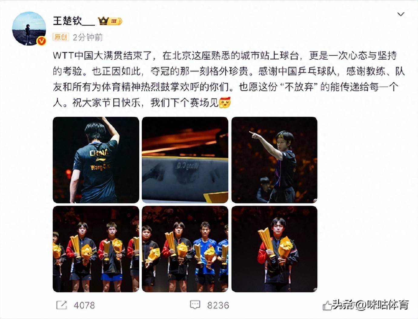 10月6日,适度WTT中国大满贯的征途的王楚钦更新社媒,发文转头了本次中国大满贯,在文中王楚钦写说念 : “WTT中国大满贯适度了,在北京这座熟习的城市站上球台,更是一次心态与坚抓的侦查。也正因如斯,夺冠的那一刻十分有数。感谢中国乒乓球队,感谢素养、队友和统统为体育精神强烈饱读掌忻悦的你们。也愿这份 “不拆除” 的能传递给每一个东说念主。祝公共节日蓬勃,咱们下个赛场见!” ","del":0,"gnid":"9217c9bcda53758c2","img_data":[{"flag":"2","img":[{"desc":"","height":"1054","title":"","url":"http://p9.img.360kuai.com/t11508c75c86caae5d3265d69a0.jpg","width":"1380"}]}],"original":0,"pat":"art_src_3,fts0,sts0","powerby":"cache","pub_time":1759756260000,"pure":"","rawurl":"http://zm.news.so.com/bde1841c143032ff70c8e020d50a311f","redirect":0,"rptid":"49e0aadb2c859193","rss_ext":[],"s":"t","src":"咪咕赛事","tag":[{"clk":"ksport_1:王楚钦","k":"王楚钦","u":""},{"clk":"ksport_1:中国乒乓球队","k":"中国乒乓球队","u":""}],"title":"王楚钦发文转头中国大满贯:愿把不拆除传递给每个东说念主!","type":"zmt","wapurl":"http://zm.news.so.com/bde1841c143032ff70c8e020d50a311f","ytag":"体育:乒球","zmt":{"brand":{},"cert":"咪咕体育赛事官方账号","desc":"上咪咕视频,畅看男篮亚洲杯、中超、五大联赛等各大体育赛事","fans_num":0,"id":"3419072182","is_brand":"0","name":"咪咕赛事","new_verify":"5","pic":"https://p0.img.360kuai.com/t11508c75c878ac7adaa75d35dd.jpg","real":1,"textimg":"https://p9.img.360kuai.com/bl/0_3/t017c4d51e87f46986f.png","verify":"0"},"zmt_status":0}","errmsg":"","errno":0}