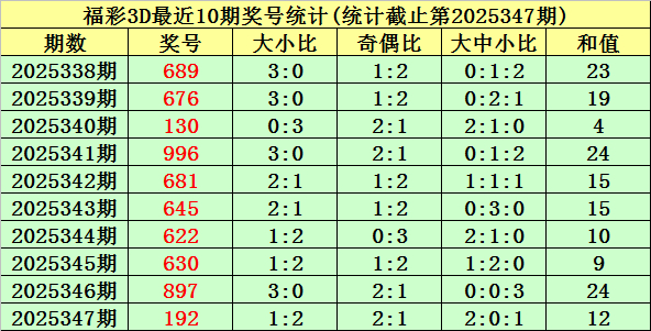 开奖回顾:福彩3D第2025347期奖号为:192。奖号类型为组六,和值为12,奇偶比为2:1,跨度为8,012路比为1:1:1,大小比为1:2。